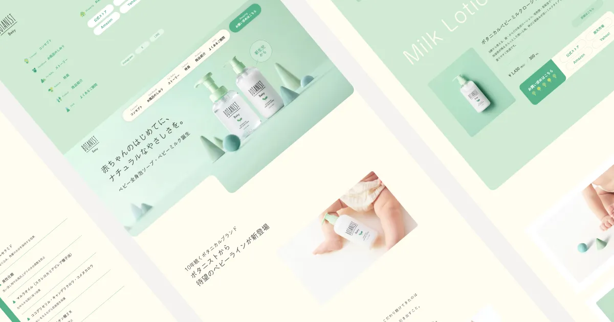 I-neコーポレートサイトとBOTANISTブランドサイトのリニューアルに引き続き、新生児から使えるボタニストの新ラインのランディングページ制作を担当させていただきました。 いそがしいママさん・パパさんにも楽しんでもらえることや、情報の得やすさ・読みやすさに重点を置いて進めていきました。 全体ではボタニストらしく「自然」を感じられる色合いやモチーフを可愛らしくアニメーションし、公開後に追加した『お風呂のしおり』ではスマホでささっと見られる使いやすさを目指しました。