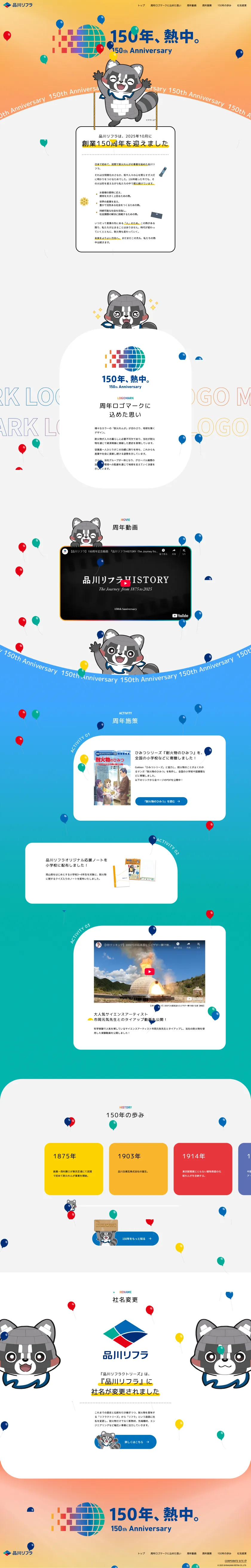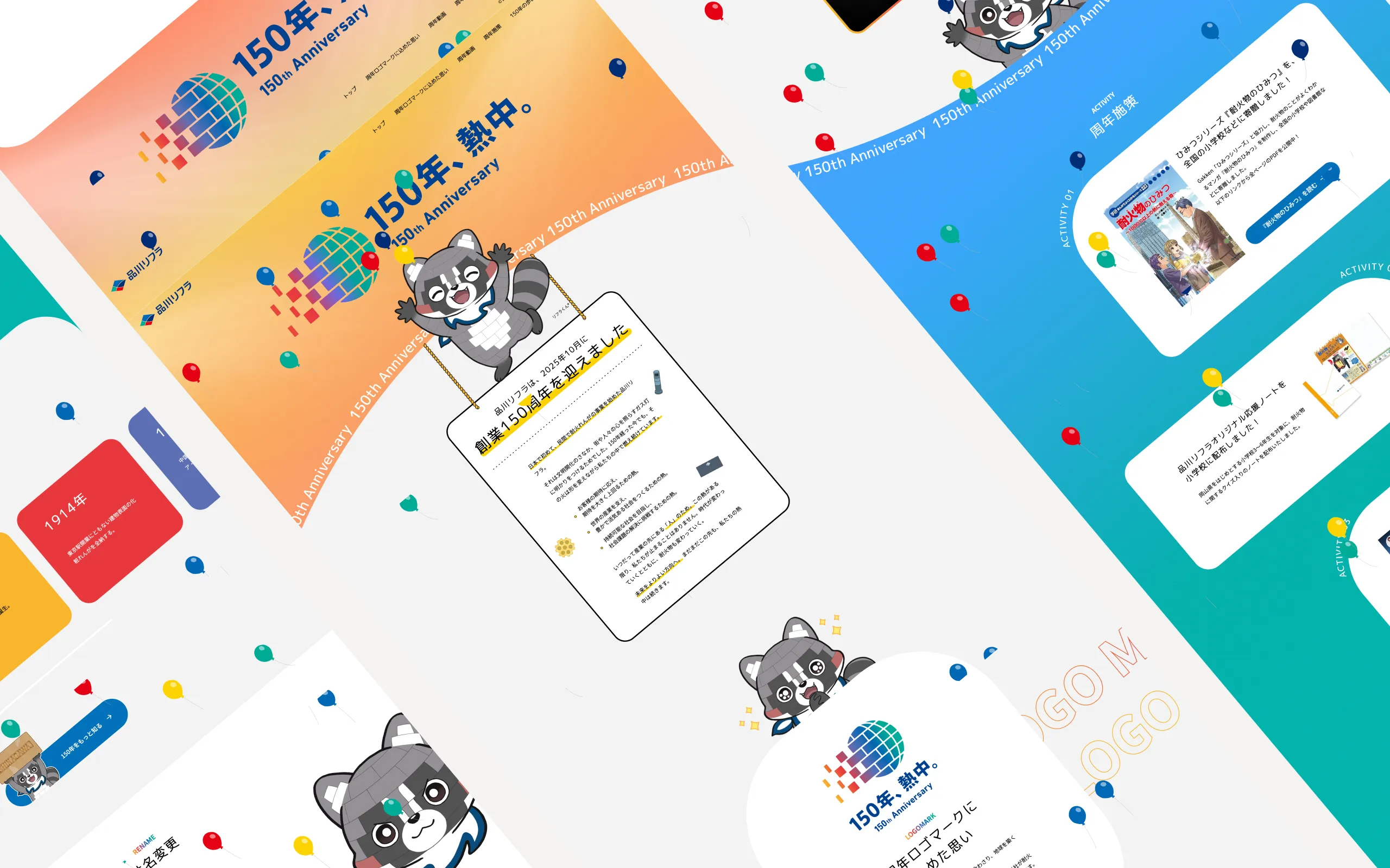 日本で初めて民間で耐火れんがの事業を始めた、品川リフラさまの創業150年をお祝いする特別サイトを制作させていただきました。 今回の周年を記念して制作されたロゴマークの様々なカラーをサイト全体に用い、品川リフラさまの公式キャラクターである『リフラくん』を可愛らしくあしらいました。 従業員の皆さまの誇りとなり、これからの躍進に胸が膨らむようなサイトになったと感じています。